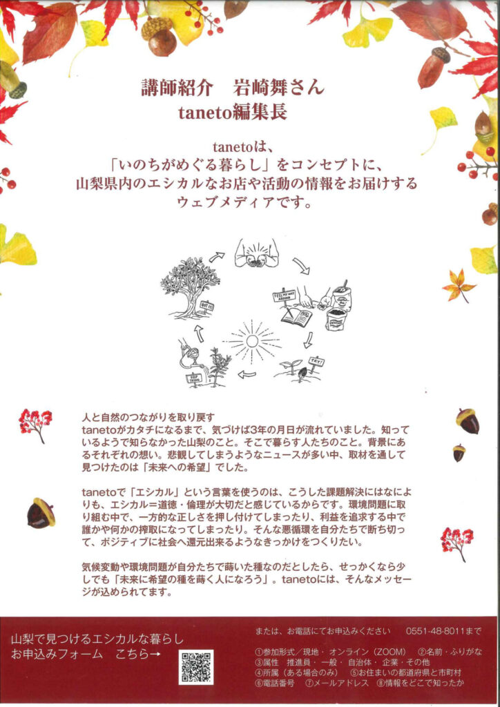 講師は、エシカルメディア「taneto」編集長の岩崎舞さん。